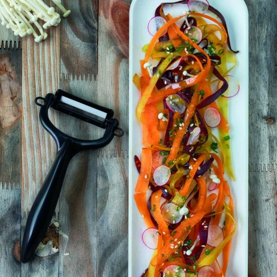 Der Keramik-Schäler und die anderen Kyocera Produkte aus hochwertiger Zirkoniakeramik sind bekannt dafür, extrem lange scharf zu bleiben. Die Klingen von Keramik-Schälern und anderen Messern sind besonders dünn, sodass mit wenig Druck sehr präzise Ergebnisse möglich sind.