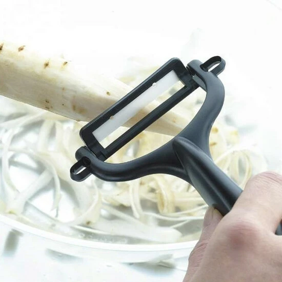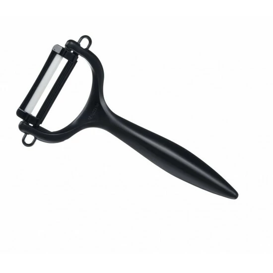 Sparschäler gehören zur Basis-Ausstattung jeder Küche. Besonders langlebig ist der Kyocera Keramik-Schäler. Äpfel, Möhren, Kartoffeln und Gurken werden fein abgeschält, ohne dass der Keramik-Schäler Metallspuren hinterlässt oder den Geschmack verändert. Die Klinge des Keramik-Schälers aus weißer Zirkoniakeramik ist korrosionsfrei und langlebig. Das sorgt für perfekte Schneidleitung – der Keramik-Schäler bleibt zehnmal länger scharf als Hartstahl.