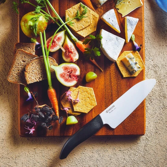 Zudem kommt die Verpackung der Schneidwerkzeuge ganz ohne Kunststoff aus. Wie bei allen Küchenutensilien von Kyocera bestehen die handgeschliffenen Keramikklingen aus besonders hochwertiger Zirkoniakeramik, einem sehr leichten und extrem harten Hightech-Material. Die dichte und glatte Klingenoberfläche ermöglicht einen präzisen und extrem scharfen Schnitt und transportiert keine Metallionen. Auch die neuenMesser behalten ihre Schärfe für einen bewundernswert langen Zeitraum. DDank des ergonomischen Griffes ausPlastik, liegt es angenehm in der Hand. Somit sind die sehr scharfen Messer ideal für Gemüse, Fisch und Fleisch – passend für jede Profi- oder Hobbyküche.